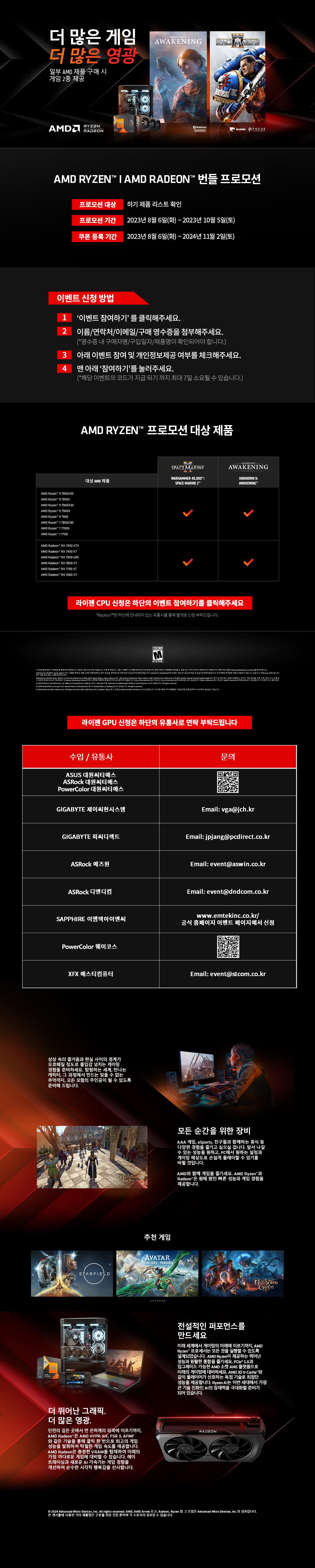 ■ 프로모션 제품 - 라데온: RX 7600 XT, RX 7700 XT, RX 7800 XT, RX 7900 GRE, RX 7900 XT, RX 7900 XTX - 라이젠: 7700, 7700X, 7800X3D, 7900, 7900X, 7900X3D, 7950X, 7950X3D